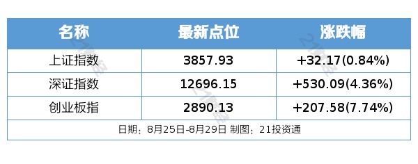 上周A股过去一周(8月25日—8月29日),A股三大指数集体上涨。截至8月29日收盘,上证指数报3857.93点,周涨0.84%;深成指报12696.15点,周涨4.36%;创业板指报2890.13点,周涨7.74%。